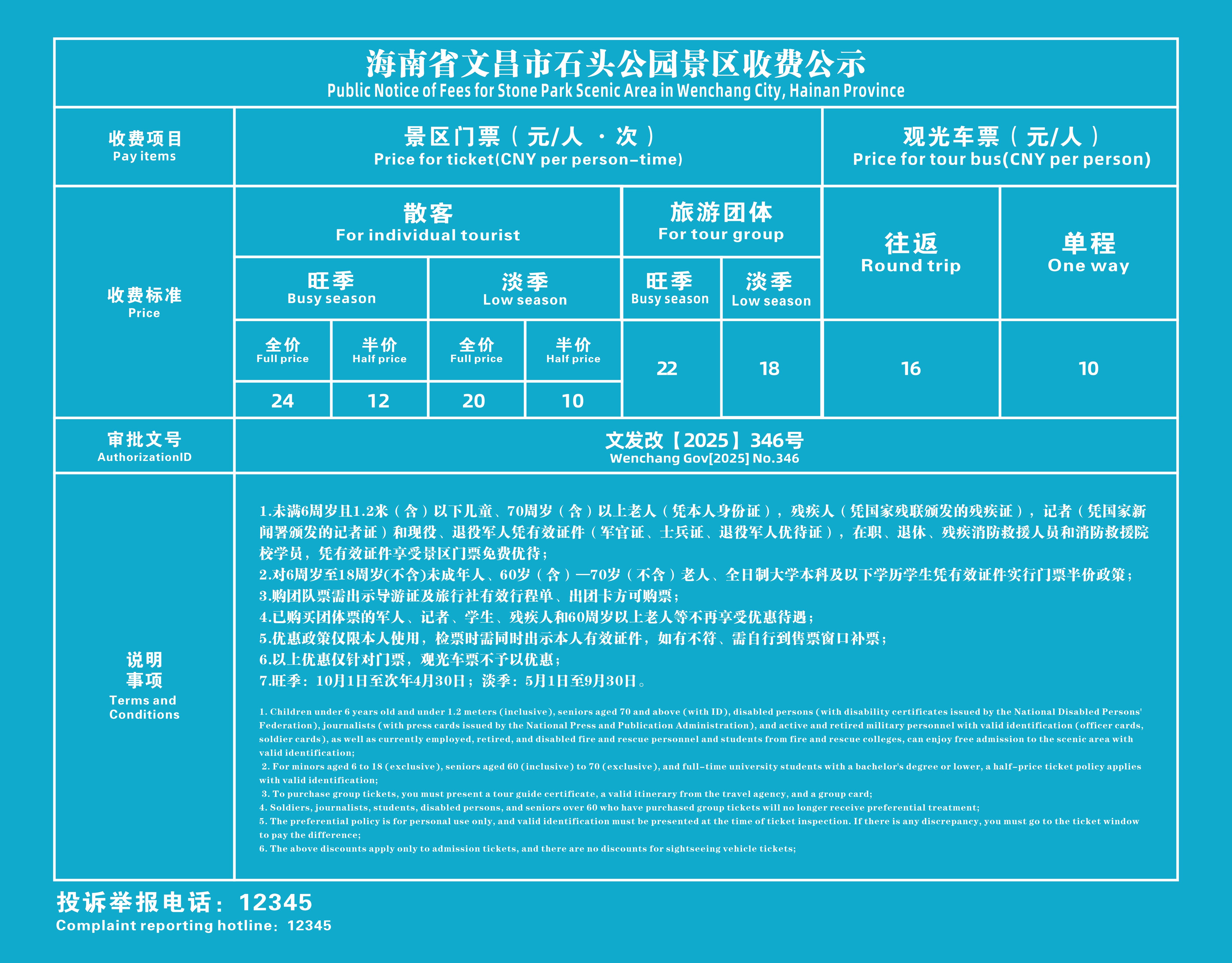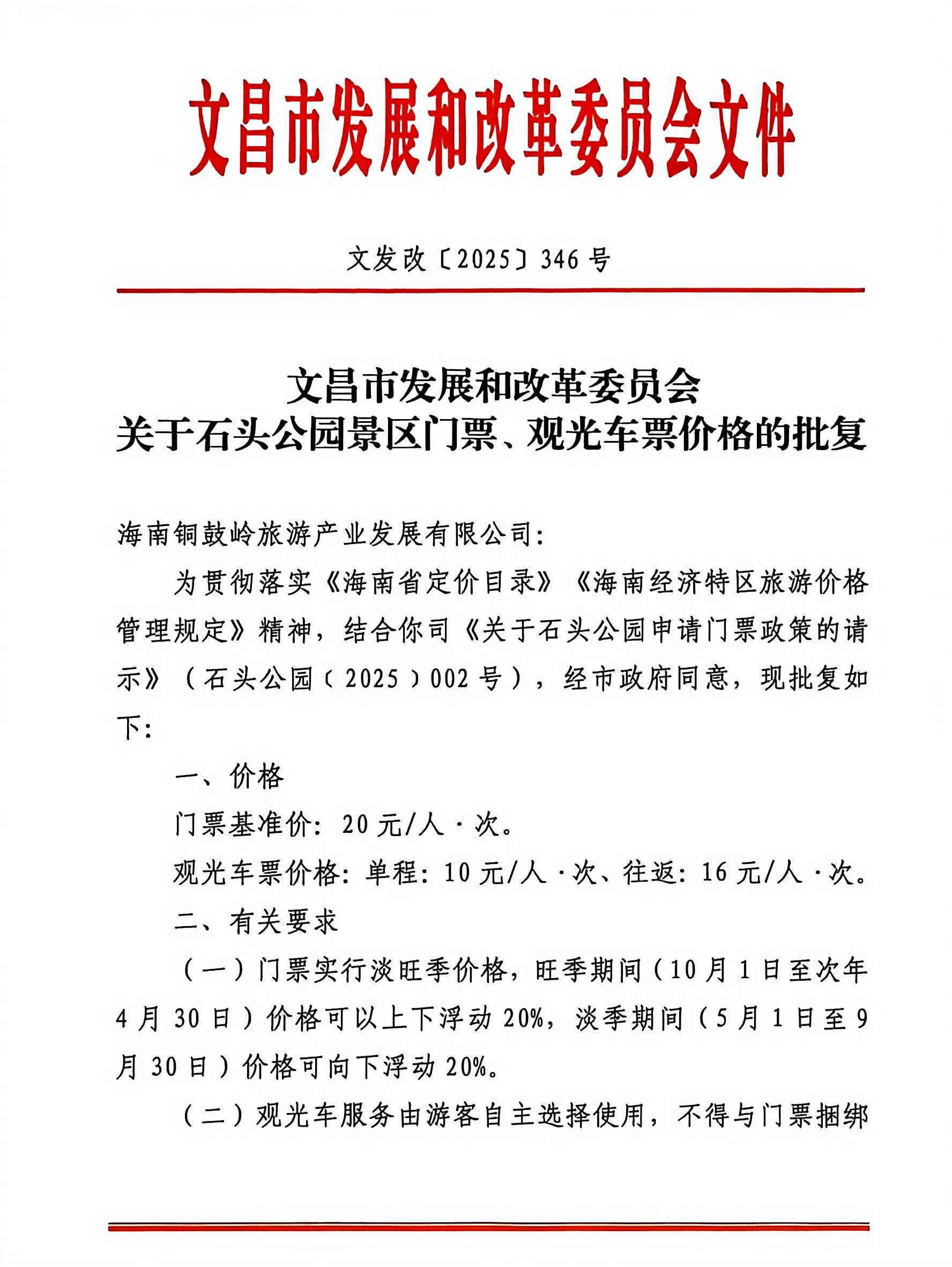 根据文昌市发展和改革委员会下发的文发改〔2025〕346号文件批示,石头公园景区决定于2025年9月22日起执行新的价格政策,具体公示如下: